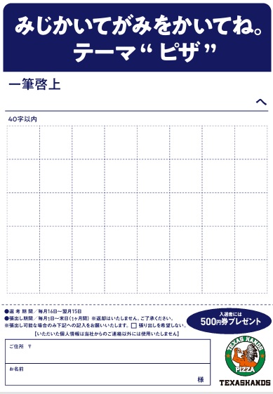 丸岡店ではピザに関する”短い文章”を募集しております。